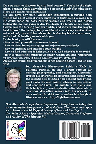 Do you want to heal yourself? Would you like to be free of pain and illnesses? Do you want to attract miracles in to your life? You’re in a right place, because Heal Yourself book gives you the instant access to 3 new easy steps to be free of pain & illnesses! Discover the book that filled with quantum energy healing secrets from Dr. Alexander Khomoutov, Ph.D.Did you have any pain? Alexander experienced a moving pain within his chest almost every night for 8 frightening months. He could sense his body getting weaker and weaker and began feeling that he was going to die. The death of a family angel, budgie Gosha, was the turning point in his life, and showed him the way to heal himself. He had an epiphany and found a very simple solution that miraculously healed him. Alexander is sharing his dramatic story and all of his healing secrets with you… In this revised and expanded Second Edition you will discover how to:heal yourself or someone in need in 3 easy stepsslow down your aging and rejuvenate your bodyoptimize and stabilize your weightfind what foods help you to heal and what foods to avoidunlock the miraculous power within you and reprogram your Quantum DNA to live a healthy and joyful lifeAmong the new additions included in this edition are: 3 new Quantum DNA communication methodsrevised food tables and an example of how to use them and more…a Questions and Answers chapter, including healing your pets: dogs, cats, birds Alexander is an inspiration, not just because he shares with you how to take healing into your own hands, but because he’s living proof that it works. If Alexander can do it, you can too! These simple yet effective techniques take only a few minutes to learn and can be used instantly.”Let Alexander’s experience inspire you! Every human being has an amazing healing power – and so do You! The time is now upon us to learn to use it! Enjoy this story of love and healing…” – Dr. John G Ryan – Specialist Medical Doctor, University ProfessorBuy this book now and be healthy!