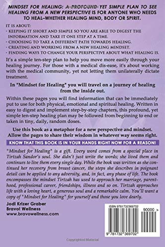 “Mindset for Healing: A Profound Yet Simple Plan to See Healing from a New Perspective” is for anyone who needs to heal–whether healing mind, body or spirit.It is about:• Keeping it short and simple so you are able to digest the information and take it one step at a time.• Choosing to take a different path towards healing.• Creating and working from a new healing mindset.• Finding ways to change your perspective about what healing is.It’s a simple ten-step plan to help you move more easily through your healing journey. For those with a medical dis-ease, it’s about working with the medical community, yet not letting them unilaterally dictate treatment. In “Mindset for Healing” you will travel on a journey of healing from the inside out.Within these pages you will find information that can be immediately put to use for both physical, emotional and spiritual healing. Written in easy to digest and implement step-by-step chapters, this profound, yet simple ten-step healing plan may be followed from beginning to end or taken in tiny, daily, random doses.Use this book as a metaphor for a new perspective and mindset. Allow the pages to share their wisdom in whatever way seems right. Know that this book is in your hands right now for a reason!”Mindset for Healing” is a gift. Every word comes from a special place in Tirtzah Sandor’s soul. She didn’t just write the words; she lived them and continues to live them every single day. While the book was written as she continued her recovery from breast cancer, the steps she describes in poignant detail can be applied to any adversity, and, in fact, any phase of life. The book encompasses the mindset Tirtzah has used to approach her marriage, parenthood, professional career, friendships, illness and so on. Tirtzah approaches life with a loving heart, a generous soul and a remarkable calm. You’ll want a copy of “Mindset for Healing” for yourself and those you love dearly. Jodi Krizer GraberBravo! Wellness www.bravowellness.com