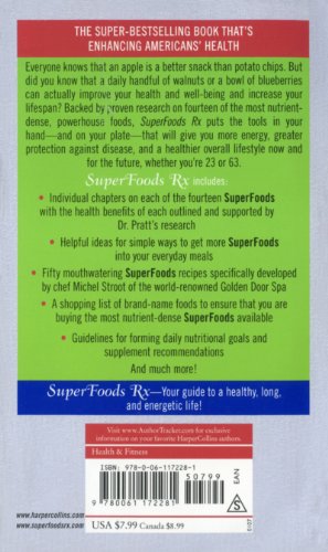 The super-bestselling book that’s enhancing Americans’ healthBy eating the fourteen SuperFoods highlighted in Dr. Steven Pratt’s instant bestseller, you can actually stop the incremental deteriorations that lead to common ailments and diseasesBeans — reduce obesity Blueberries — lower risk for cardiovascular disease Broccoli — lowers the incidence of cataracts and fights birth defects Oats — reduce the risk of type II diabetesOranges — prevent strokesPumpkin — lowers the risk of various cancers Wild salmon — lowers the risk of heart diseaseSoy — lowers cholesterol Spinach — decreases the chance of cardiovascular disease and age-related macular degeneration Tea — helps prevent osteoporosis Tomatoes — raise the skin’s sun protection factor Turkey — helps build a strong immune system Walnuts — reduce the risk of developing coronary heart disease, diabetes, and cancer * Yogurt-promotes strong bones and a healthy heartSuperFoods Rx includes recipes created by Chef Michel Stroot of the Golden Door Spa and teaches you how to incorporate SuperFoods and their sidekicks into your diet. SuperFoods Rx is an indispensable guide to a healthy, long, and energetic life.